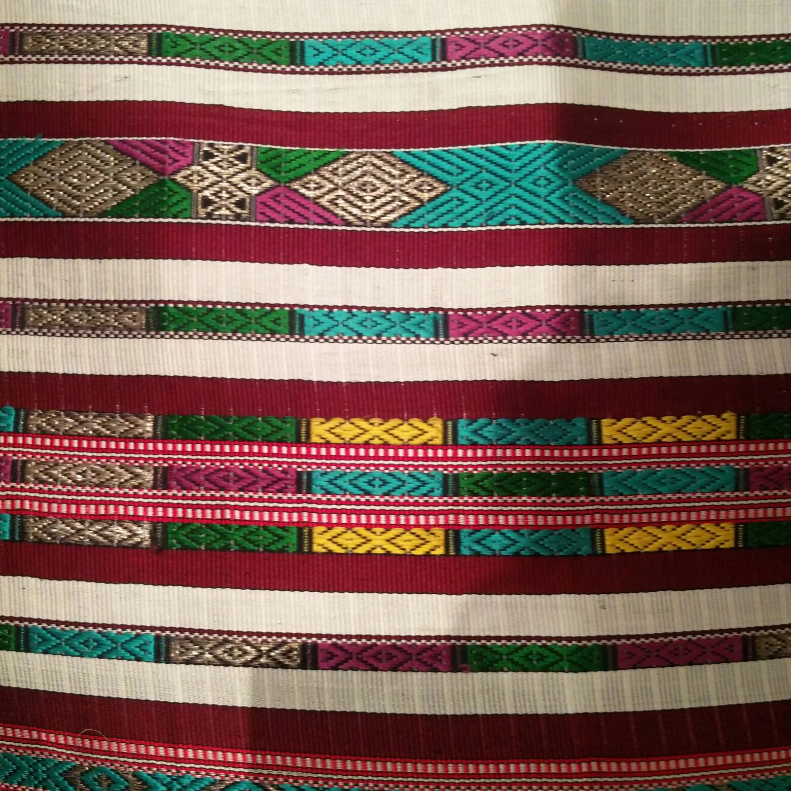 Pieces of bright crimson and white cloth hang from a thin rope. Under the white lights of P21, the intricate detailing of the cloth suggests that it is certainly not ordinary. Weaved with cotton and mixed with silk and silver thread using geometric designs and symbols, the cloths revive a unique form of weaving called the pomegranate seed weave. Originating in the capital city of Tripoli in the 1800s, the pomegranate seed weave was widely practised in different cities in the past and passed down family lines. Created by the only remaining woman in Libya to master the weave, Najat Abeed, the installation positions itself firmly as a witness to the changing of the Libyan landscape. The result is a piece of art that almost sends a stress signal about its vulnerable position as a tangible, palpable emblem of Libya, now facing the risk of fading away.